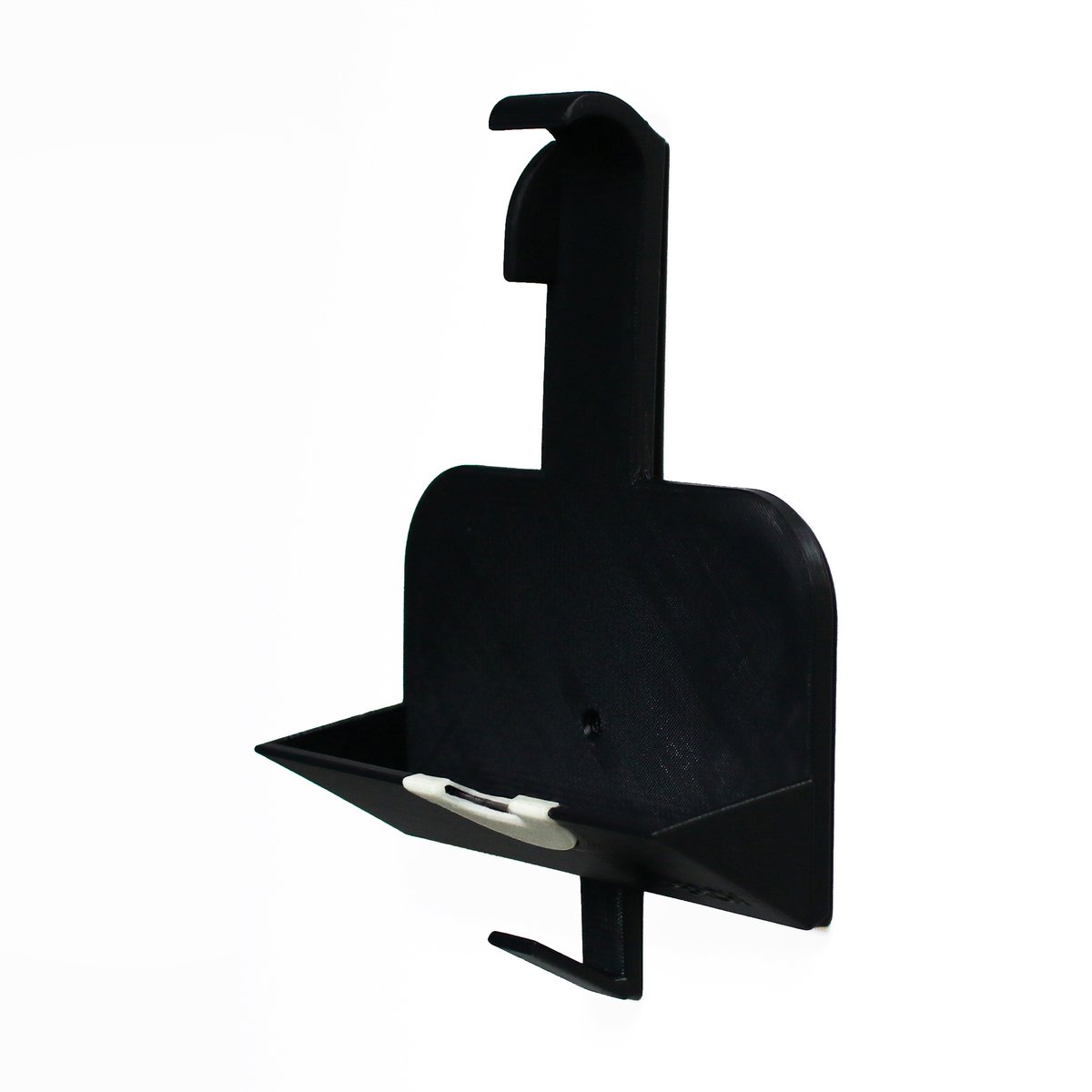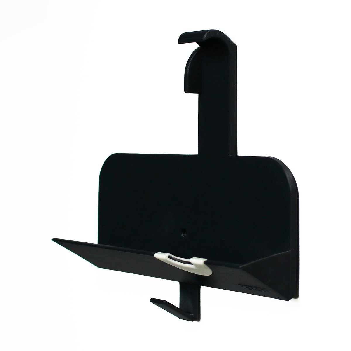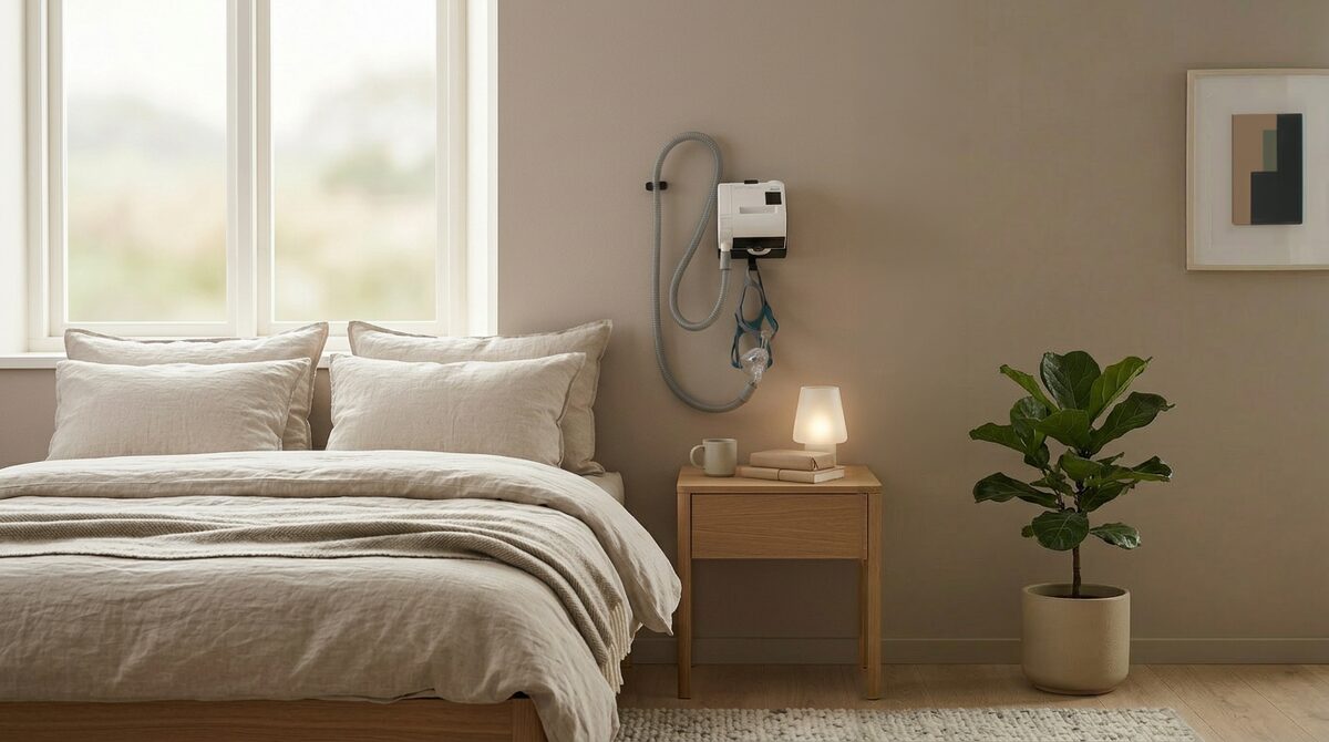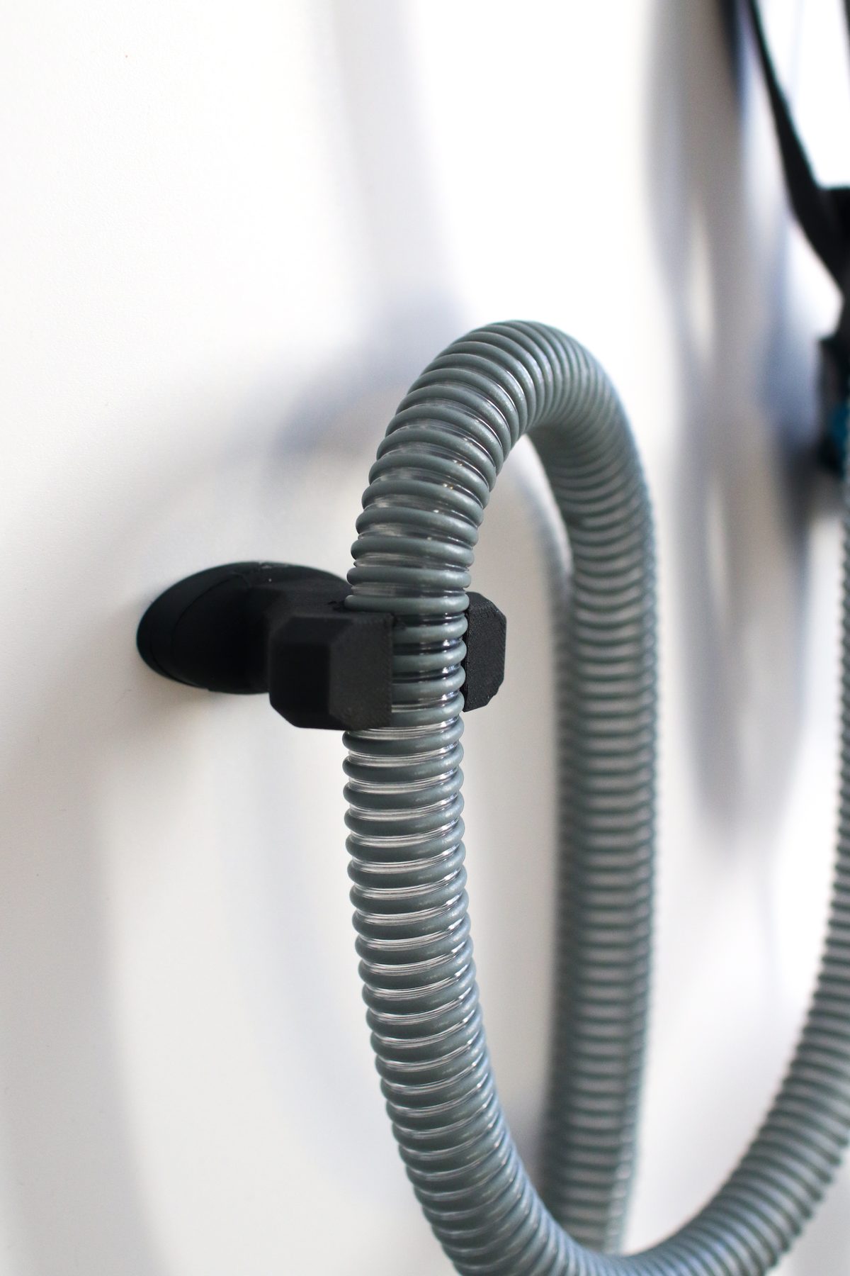 90-Grad-Wandhalterung mit geschütztem Klemmsystem. Lösbare Wandanbringung. Nachleuchtender Einsatz unter dem An/Aus-Schalter. Haken für CPAP-Maske.